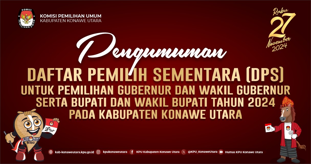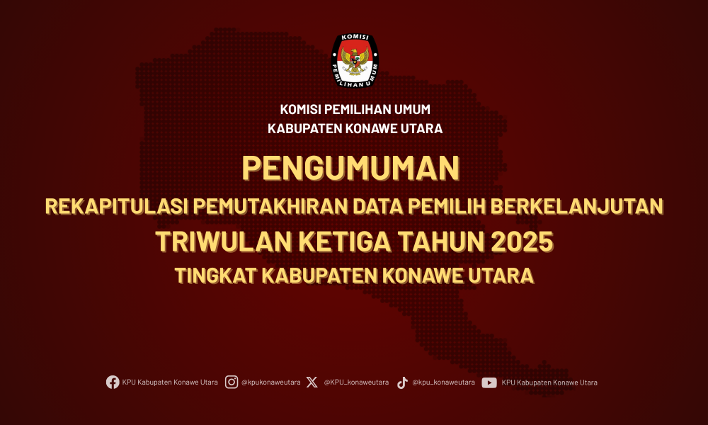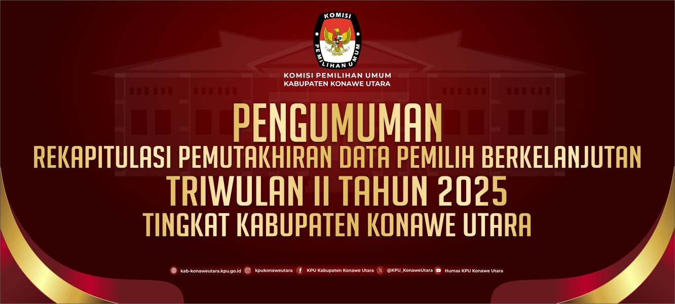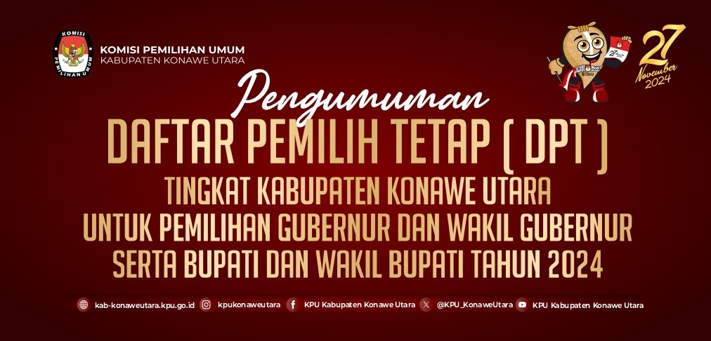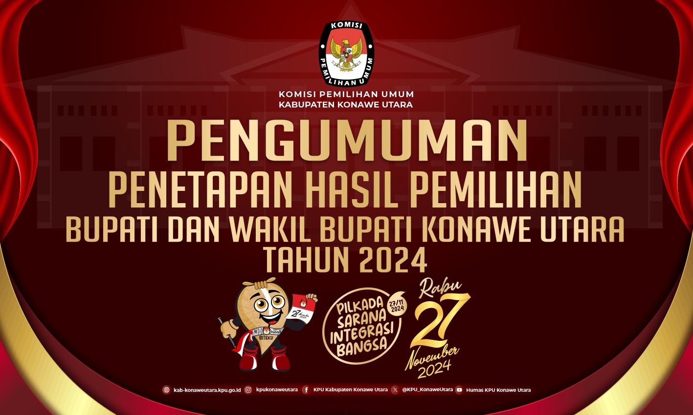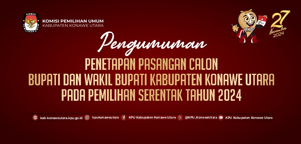Wanggudu, 22 September 2024 Berdasarkan Ketentuan Pasat 120, angka 4 Peraturan Komisi Pemilihan Umum Nomor 8 Tahun 2024 tentang Pencalonan Gubernur dan Wakil Gubernur, Bupati dan Wakil Bupati, serta Walikota dan Wakil Walikota, Komisi Pemilihan Umum Kabupaten Konawe Utara mengumumkan Penetapan Pasangan Calon Bupati dan Wakil Bupati Kabupaten Konawe Utara pada Pemilihan Serentak Tahun 2024.
