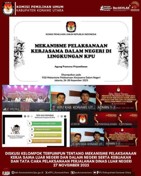 Wanggudu, kab-konaweutara.kpu.go.id. Kamis, 27 November 2025 Komisi Pemilihan Umum Republik Indonesia menggelar Diskusi Kelompok Terpumpun Tentang Mekanisme Pelaksanaan Kerja Sama Luar Negeri Dan Dalam Negeri Serta Kebijakan dan Tata Cara Pelaksanaan Perjalanan Dinas Luar Negeri secara daring melalui aplikasi Zoom Meeting.