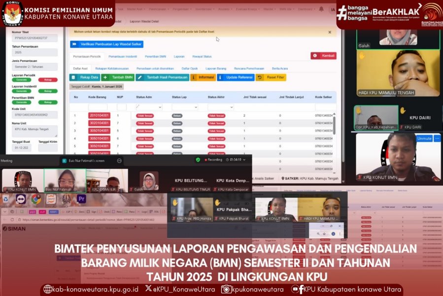 Melalui kegiatan ini, seluruh satuan kerja diharapkan dapat meningkatkan pemahaman dan kemampuan dalam menyusun laporan pengawasan dan pengendalian BMN Semester II dan Tahunan Tahun 2025 secara tepat waktu, akurat, dan akuntabel. Hal ini juga wujud komitmen KPU dalam memastikan pengelolaan BMN berjalan secara transparan, tertib, dan bertanggung jawab. Hadir secara daring dalam kegiatan ini Operator SIMAN KPU Kabupaten Konawe Utara Andi Panji Soelystiawan Noviatma. (WA)