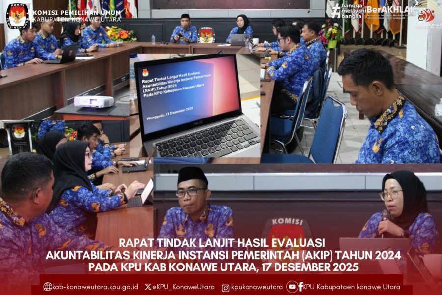 Wanggudu, kab-konaweutara.kpu.go.id. Rabu, 17 Desember 2025 Komisi Pemilihan Umum Kabupaten Konawe Utara menyelenggarakan Rapat Tindak Lanjut Hasil Evaluasi Akuntabilitas Kinerja Instansi Pemerintah (AKIP) Tahun 2024 sebagai bentuk komitmen dalam meningkatkan kualitas kinerja dan tata kelola pemerintahan yang akuntabel. Kegiatan ini dilaksanakan sebagai tindak lanjut atas hasil evaluasi AKIP Tahun 2024 pada KPU Provinsi dan KPU Kabupaten/Kota di wilayah Provinsi Sulawesi Tenggara, serta berpedoman pada ketentuan peraturan perundang-undangan terkait sistem akuntabilitas kinerja instansi pemerintah. Rapat ini diikuti oleh Anggota KPU Kabupaten Konawe Utara, Sekretaris, para Kepala Subbagian, serta seluruh staf Aparatur Sipil Negara (ASN) di lingkungan Sekretariat KPU Kabupaten Konawe Utara. Melalui kegiatan ini, diharapkan seluruh jajaran KPU Kabupaten Konawe Utara dapat memahami hasil evaluasi AKIP secara komprehensif serta menyusun langkah-langkah perbaikan yang terukur dan berkelanjutan dalam upaya peningkatan kinerja organisasi, penguatan akuntabilitas, serta perwujudan birokrasi yang profesional, transparan, dan berorientasi pada hasil. KPU Kabupaten Konawe Utara juga terus berkomitmen untuk meningkatkan kualitas perencanaan, pelaksanaan, dan pelaporan kinerja sebagai wujud pertanggungjawaban kepada publik. (WA)