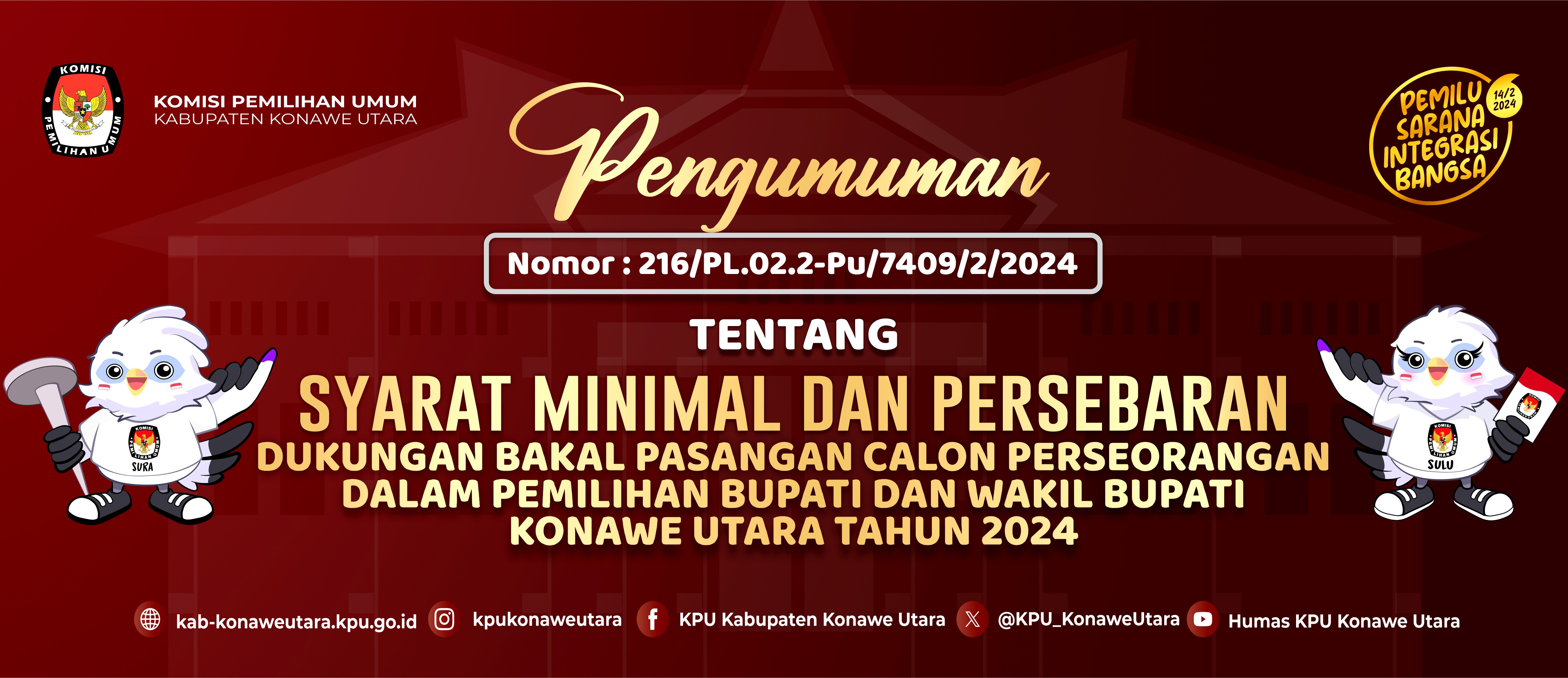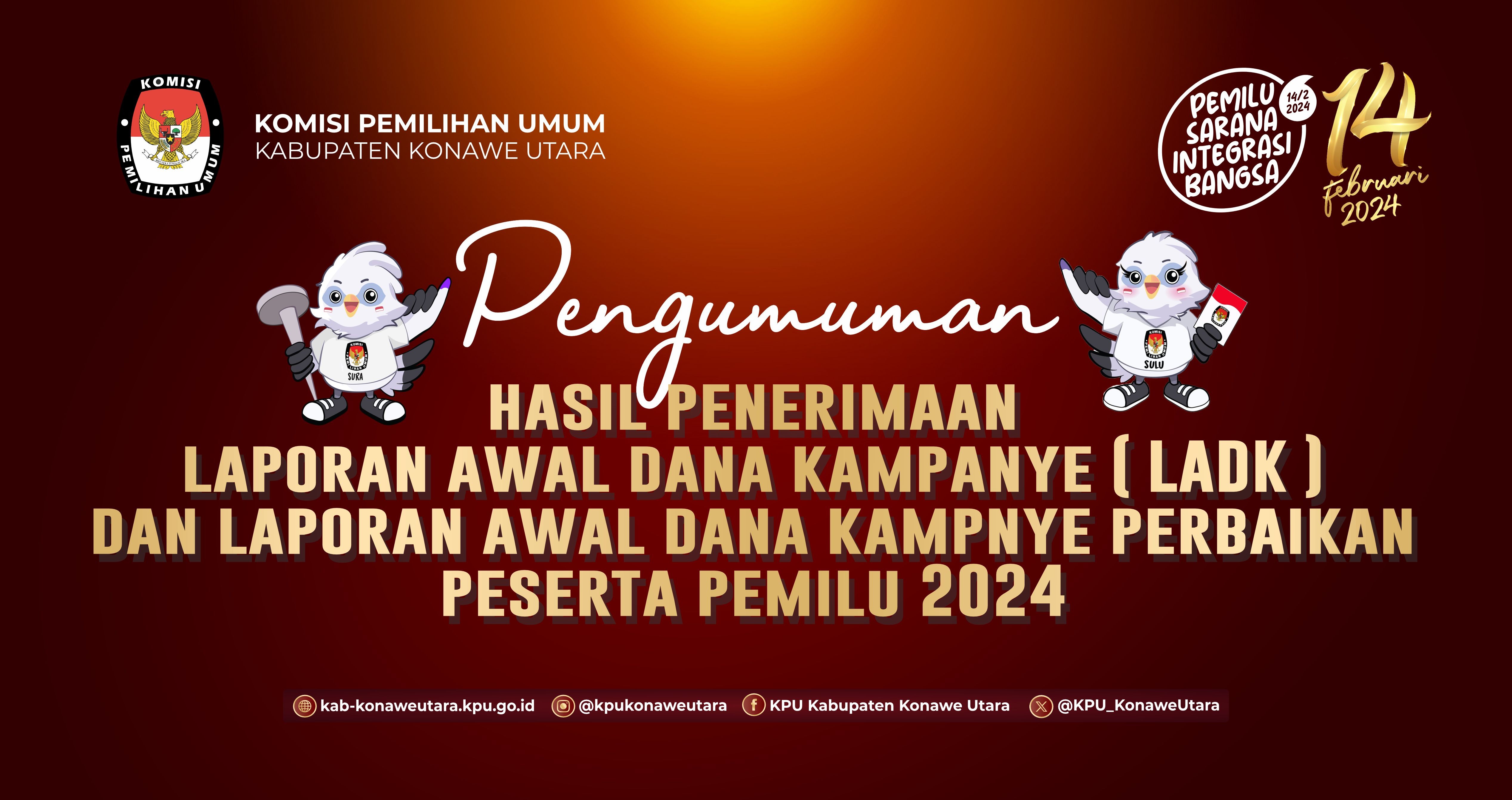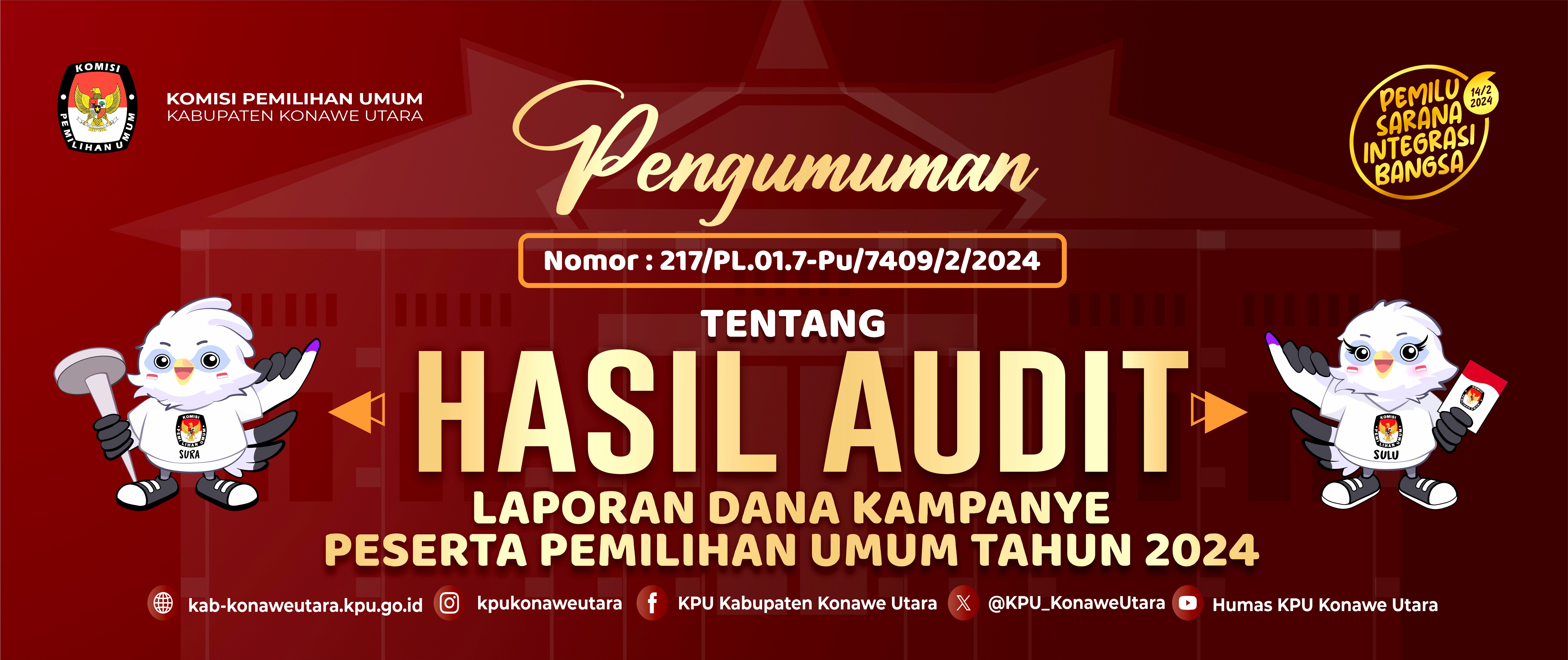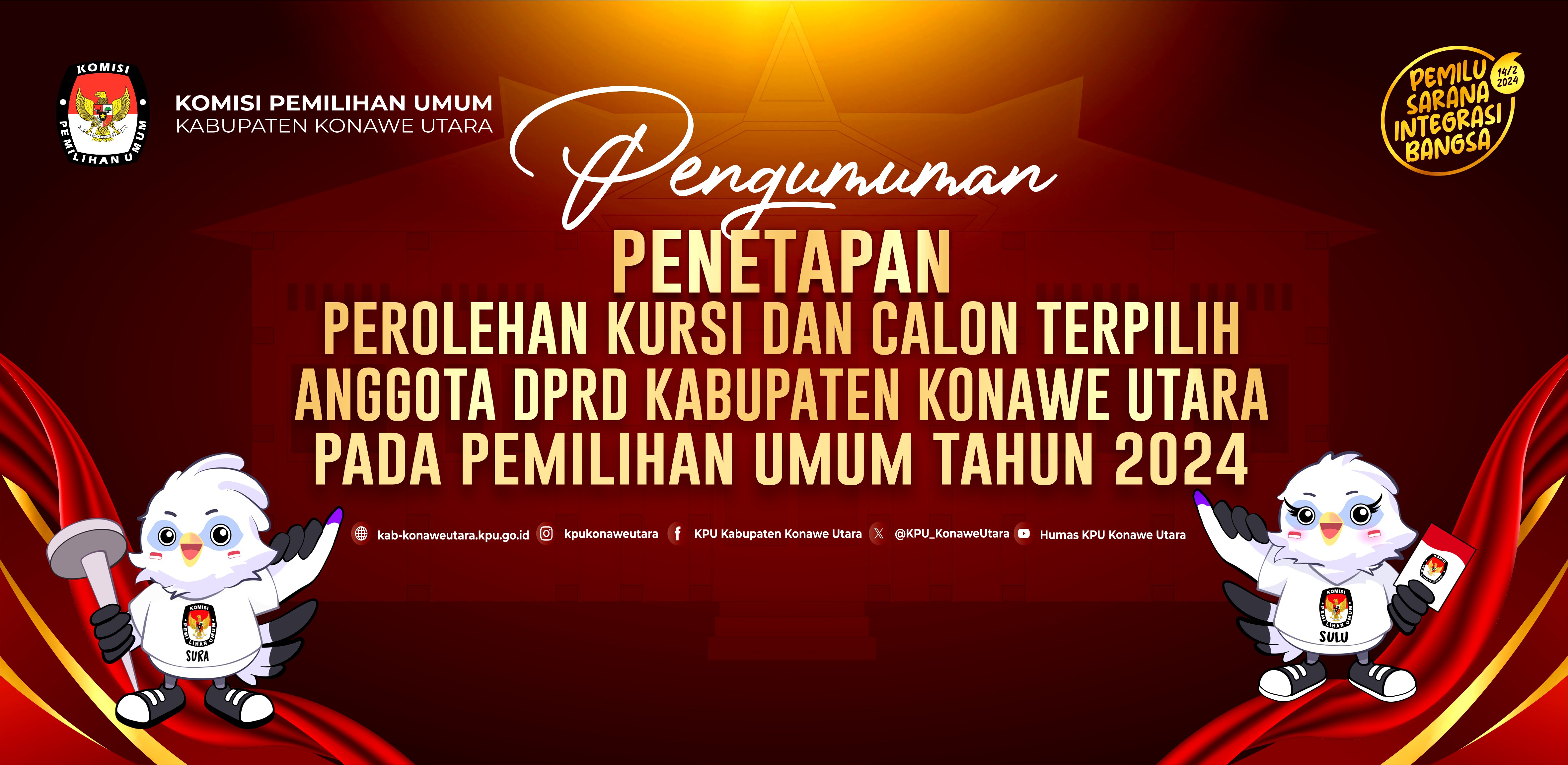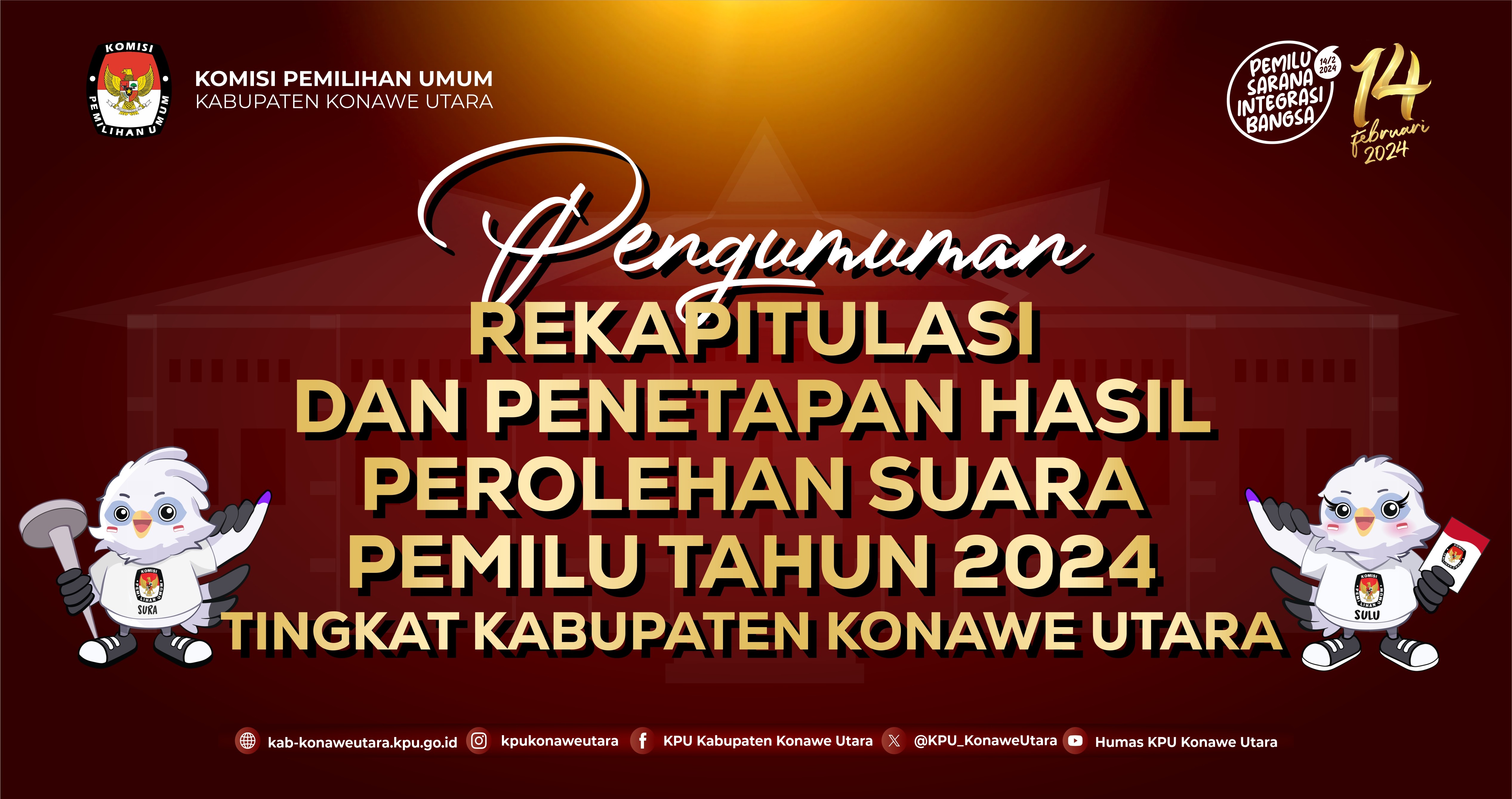 kab-konaweutara.kpu.go.id Wanggudu, 3 Maret 2024, Menindaklanjuti ketentuan pasal 55 ayat (1) Peraturan Komisi Pemilihan Umum Nomor 5 Tahun 2024 tentang Rekapitulasi Hasil Penghitungan Suara dan Penetapan Hasil Pemilu yang menyatakan bahwa KPU Kabupaten/Kota mengumumkan rekapitulasi hasil penghitungan perolehan suara Pemilu Presiden, anggota DPR, DPD, DPRD Provinsi, dan DPRD kabupaten/kota setelah rekapitulasi hasil penghitungan perolehan suara selesai, maka Komisi Pemi-lihan Umum Kabupaten Konawe Utara mengumumkan Rekapitulasi Hasil Penghitungan Perolehan Suara Pemilihan Umum Presiden dan Wakil Presiden, Anggota Dewan Perwakilan Ralryat Daerah, Anggota Dewan Perwakilan Daerah, Anggota Dewan Perwakilan Ralryat Daerah Provinsi dan Anggota Dewan Perwakilan Ralryat Daerah Kabupaten/Kota di Kabupaten Konawe Utara dalam formulir D-Hasil Kabko-PPWP, Formulir D-Hasil Kabko-DPR, Formulir D-Hasil Kabko-DPRD Provinsi, Formulir D-Hasil Kabko-DPRD Kab/Kota