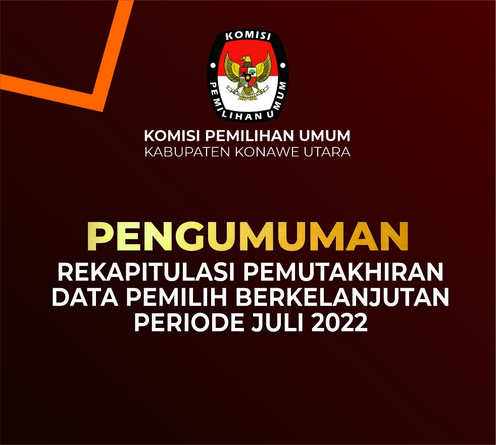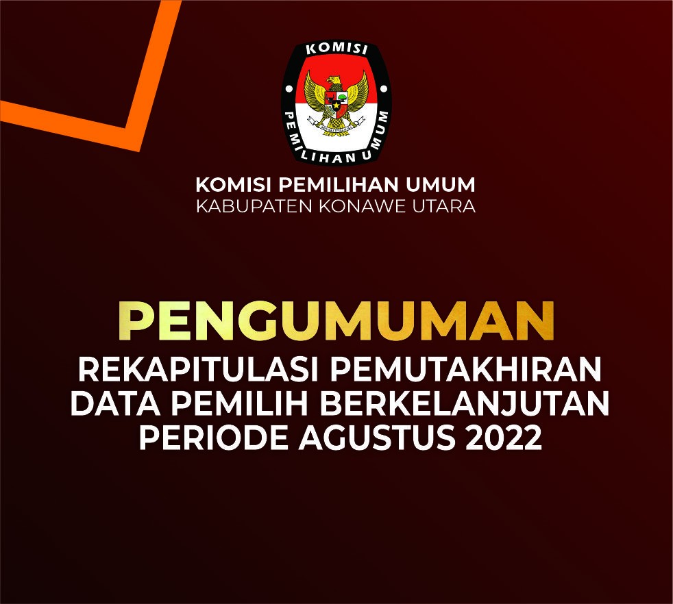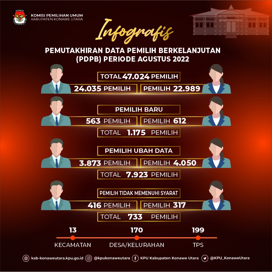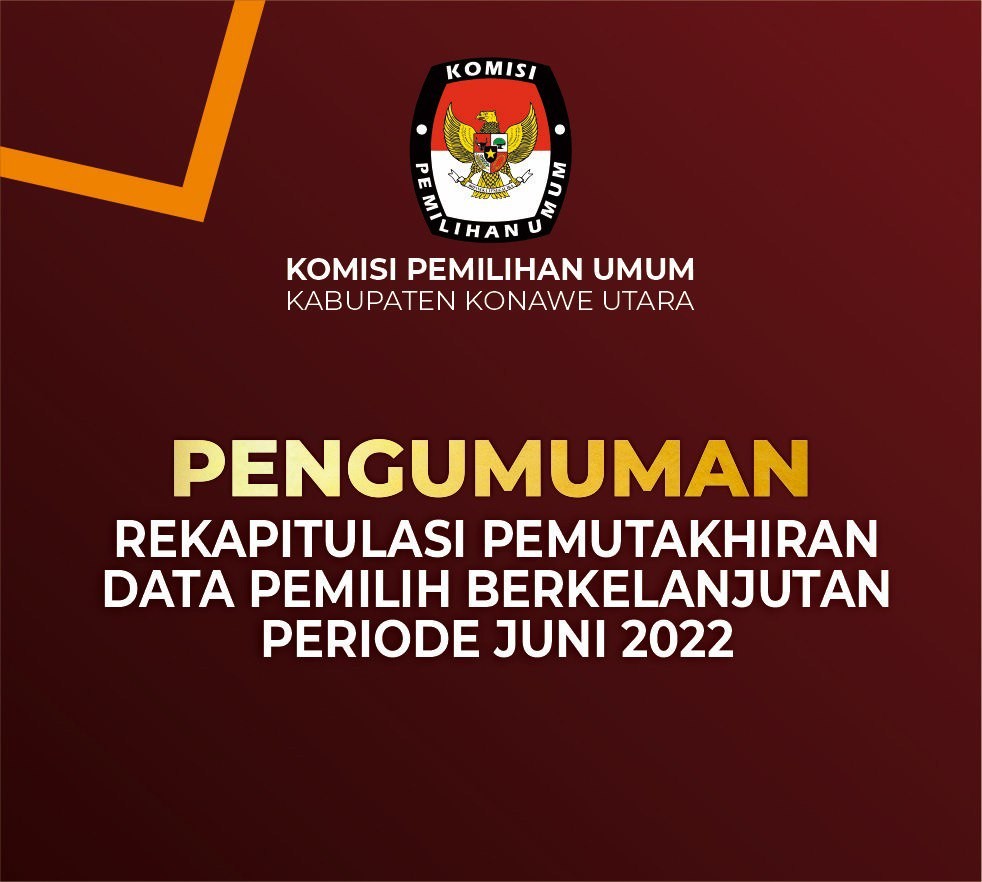 Wanggudu, Selasa (30/08) KPU Kabupaten Konawe Utara menggelar Rapat Pleno Rutin yang salah satu agendanya adalah Rekapitulasi Pemutakhiran Daftar Pemilih Berkelanjutan Periode Agustus 2022. Digelar di Ruang Rapat Kantor KPU Kabupaten Konawe Utara, Pelaksanaan Rekapitulasi ini berdasarkan ketentuan Peraturan Komisi Pemilihan Umum Nomor 6 Tahun 2021 tentang Pemutakhiran Data Pemilih Berkelanjutan. Rapat Rekapitulasi tersebut menghasilkan hal-hal sebagai berikut: Rekapitulasi Pemutakhiran Daftar Pemilih Berkelanjutan (PDPB) Bulan Agustus 2022 adalah sebagai berikut : Pemilih Baru sejumlah 1175 (seribu seratus tujuh puluh lima) dengan rincian pemilih laki-laki berjumlah 563 (lima ratus enam puluh tiga) pemilih dan pemilih perempuan berjumlah 612 (enam ratus dua belas) pemilih yang tersebar di 13 (tiga belas) Kecamatan, 170 (seratus tujuh puluh) Desa/Kelurahan dan 199 (seratus Sembilan puluh sembilan) TPS se-Kabupaten Konawe Utara; Pemilih Tidak Memenuhi Syarat (TMS) sejumlah 733 (tujuh ratus tiga puluh tiga) dengan rincian pemilih laki-laki berjumlah 416 (empat ratus enam belas) pemilih dan pemilih perempuan berjumlah 317 (tiga ratus tujuh belas) pemilih yang tersebar di 13 (tiga belas) Kecamatan, 170 (seratus tujuh puluh) Desa/Kelurahan dan 199 (seratus Sembilan puluh sembilan) TPS se-Kabupaten Konawe Utara; Pemilih Ubah Data sejumlah 7923 (tujuh ribu Sembilan ratus dua puluh tiga) dengan rincian pemilih laki-laki berjumlah 3873 (tiga ribu delapan ratus tujuh puluh tiga) pemilih dan pemilih perempuan berjumlah 4050 (empat ribu lima puluh) pemilih yang tersebar di 13 (tiga belas) Kecamatan, 170 (seratus tujuh puluh) Desa/Kelurahan dan 199 (seratus Sembilan puluh sembilan) TPS se-Kabupaten Konawe Utara. Sehingga Rekapitulasi Pemutakhiran Data Pemilih Berkelanjutan (PDPB) Periode Agustus 2022 menjadi 47.024 (empat puluh tujuh ribu ldua puluh empat) pemilih dengan rincian Laki-Laki sebanyak 24.035 (dua puluh empat ribu tiga puluh lima) pemilih, dan Perempuan sebanyak 22.989 (dua puluh dua ribu sembilan ratus delapan puluh sembilan) pemilih yang tersebar di 13 (tiga belas) Kecamatan, 170 (seratus tujuh puluh) Desa/Kelurahan dan 199 (seratus sembilan puluh sembilan) TPS se-Kabupaten Konawe Utara. Download Pengumuman disini